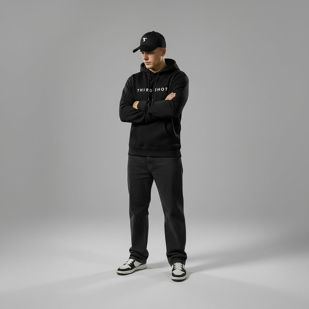 A classic six-panel cap with a curved brim and structured fit. Made from smooth matte fabric with fine stitching for a clean finish. The front features the Third Shot “TS” logo, embroidered with precise detail for a premium look. Adjustable strap at the back for a comfortable fit.