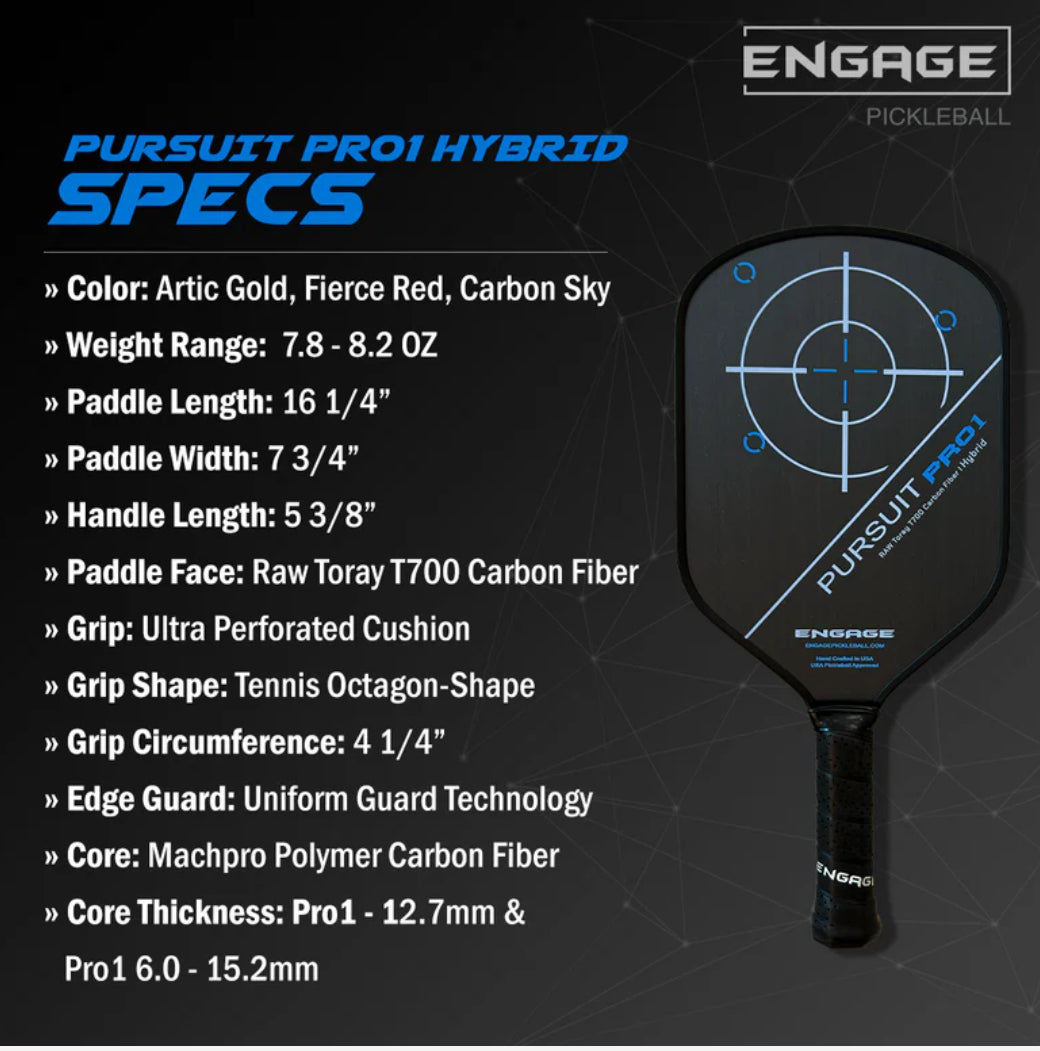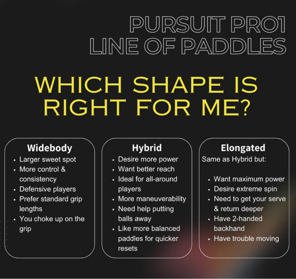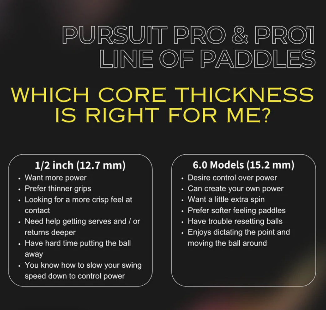 - Uniform Handle Circumference – The Pursuit Pro1 introduces a consistent 4 ¼ inch grip circumference across both 1/2 inch and 5/8 inch paddle thicknesses.