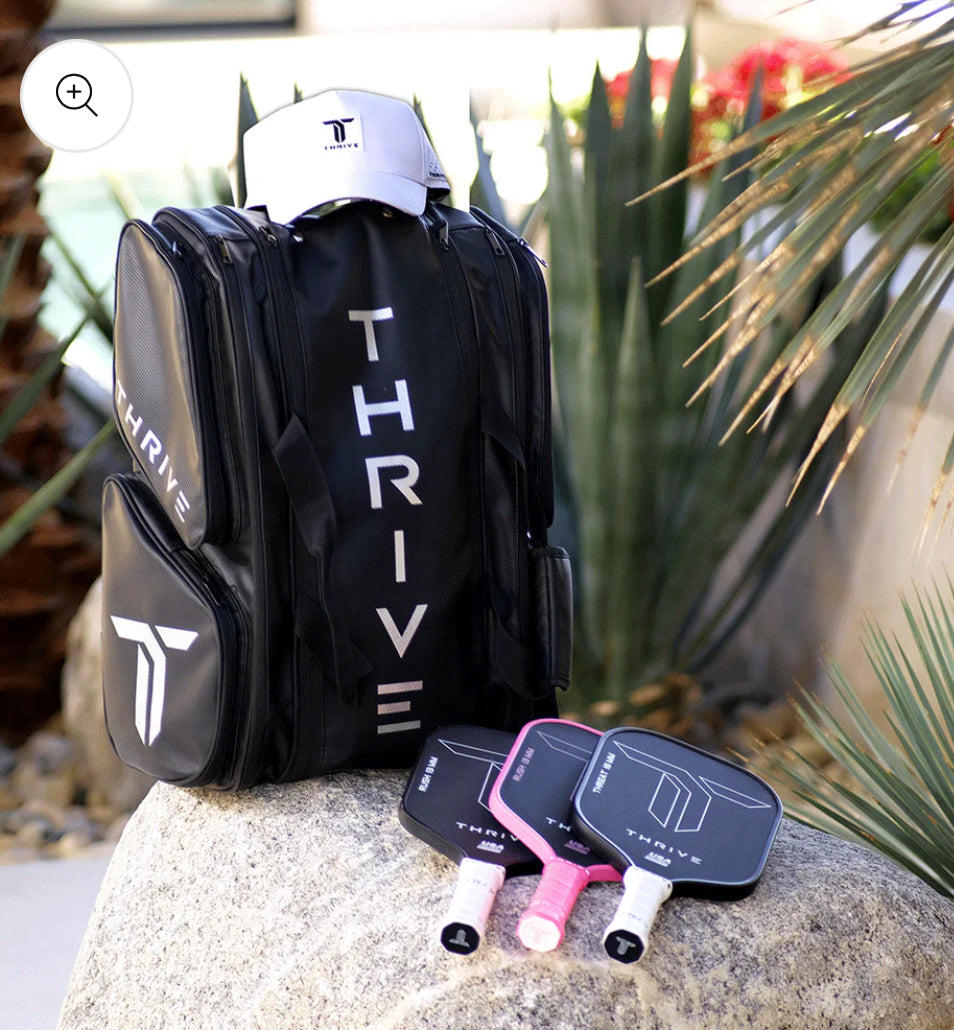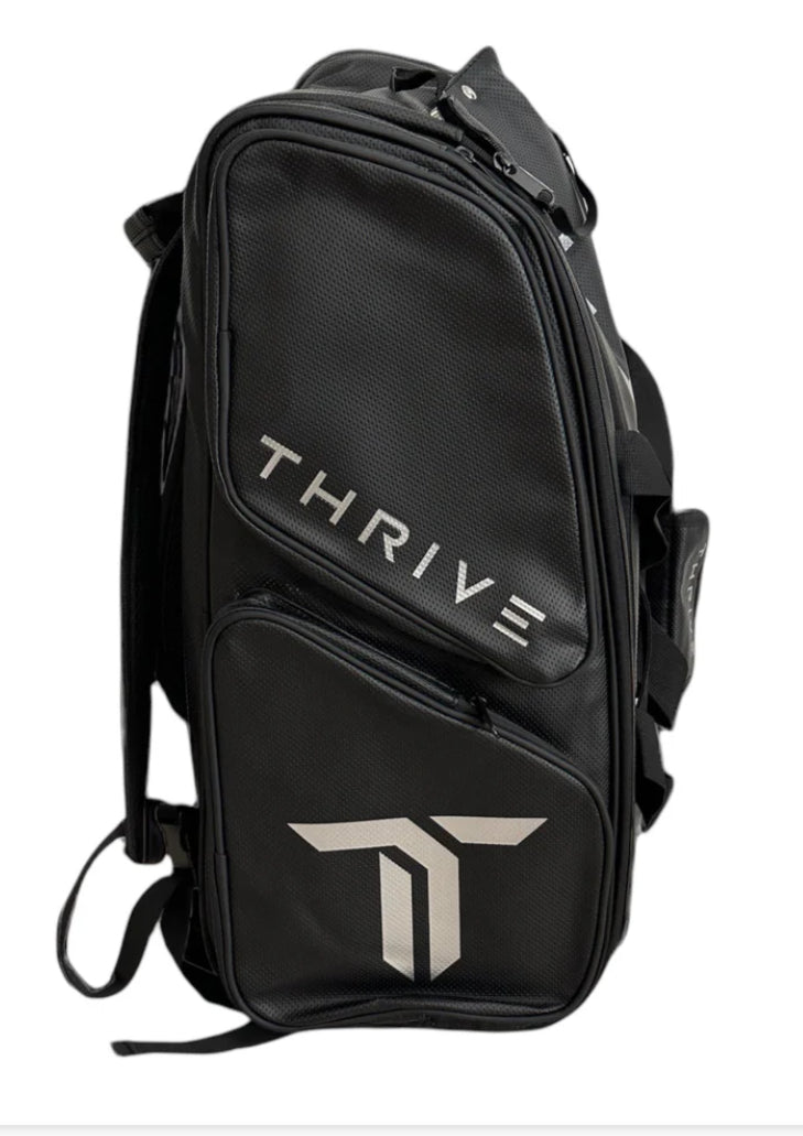 Thrive Elite Pro Tour Bag is made of 100% vegan leather and designed for the player who wants to look good and travel to the courts in style. This bag has room for all your paddles and accessories and doubles as carry-on luggage. The backpack straps have a hidden zippered compartment for easy storage when traveling. The hidden fence hook is ideal to hang your bag while playing. The paddle compartments are thermal lined to protect your paddles from extreme heat. There are (4) outside zippered pockets as well as zippered pockets in the inside to the bag along with a shoe compartment. This bag also comes with a separate Thrive shoe bag.