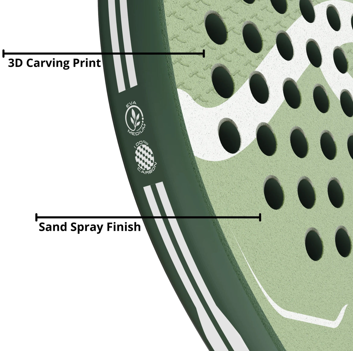 Featuring an EVA Medium core for precision and power, a lightweight 100% carbon frame for agility and durability, and a sand-spray finish for enhanced grip and spin. Anti-Shock Technology reduces vibrations for a smoother playing experience, even in intense matches.